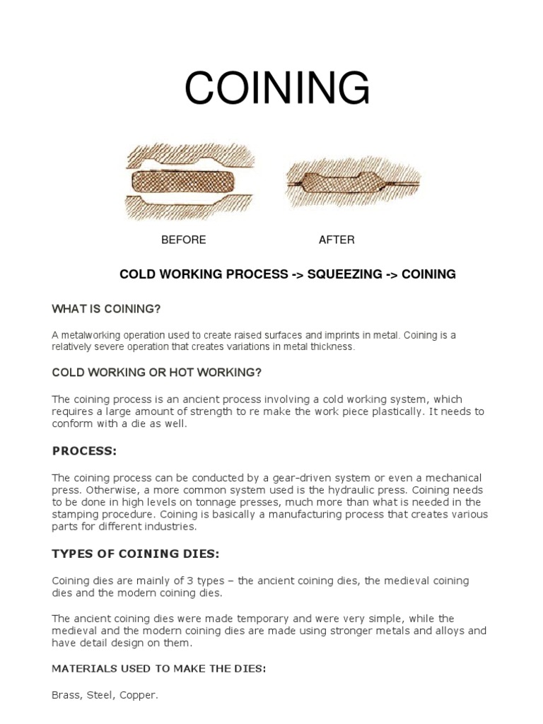 Coining is a form of precision stamping in which a workpiece is subjected to a sufficiently high stress to induce plastic flow on the surface of the material. A simple round metal slug is placed into the die and forced to flow into a given shape by compressing it see figure 3. Coining can produce an inside radius as low as 0 4 t with a 5 t width of the v opening. In coining the sheet metal is more than just bent it is actually thinned by the impact of the punch and die as it is compressed between them along the bending surfaces fig.